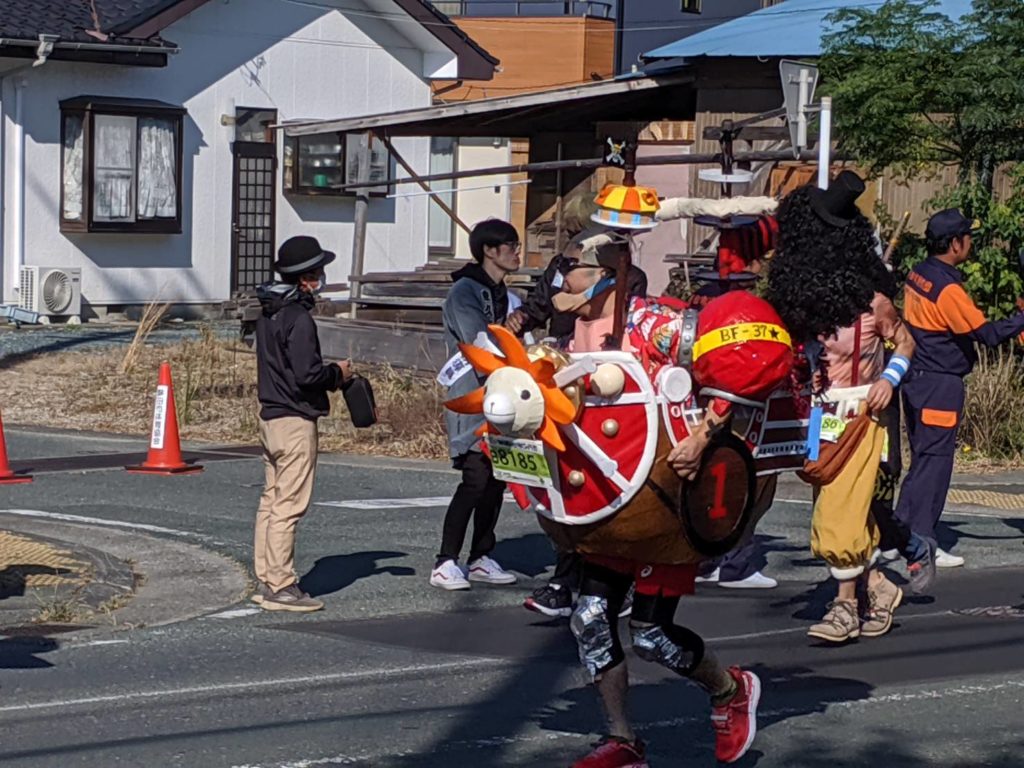 そして、ジュビロマラソンのもうひとつの見所は仮装です。コンテストがあり、毎回、思考を凝らした仮装を見ることが出来ます。今年はルパンやルフィ一味が見れました。