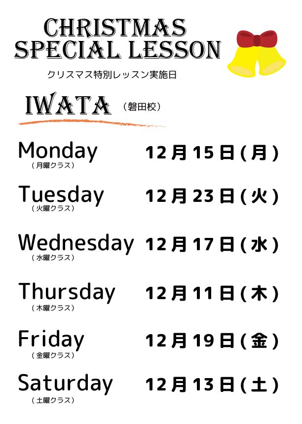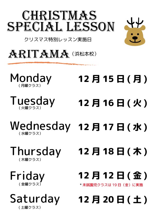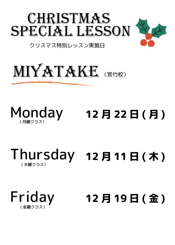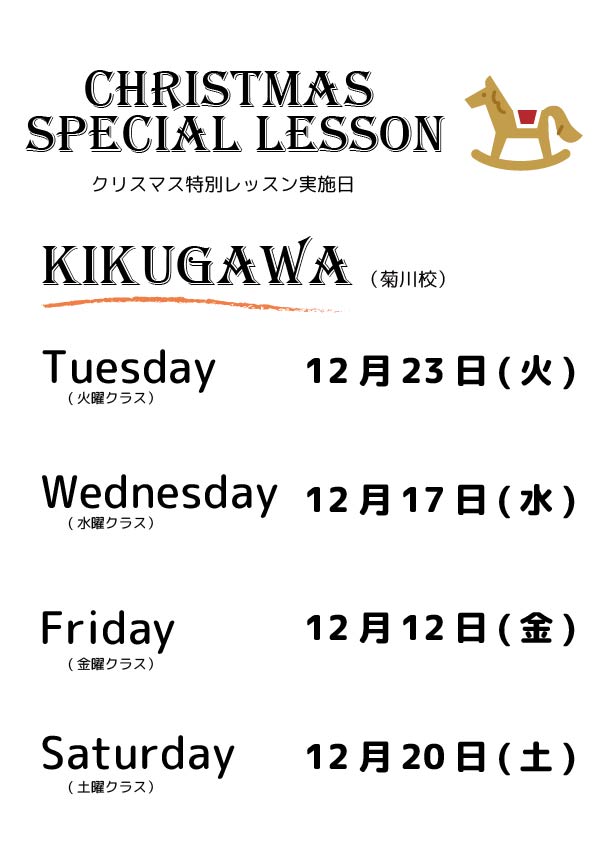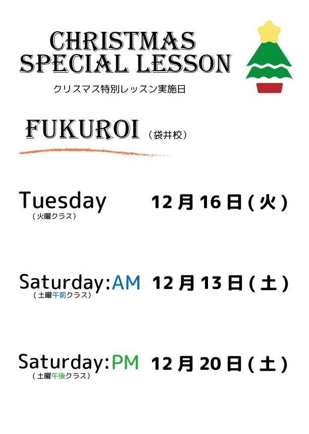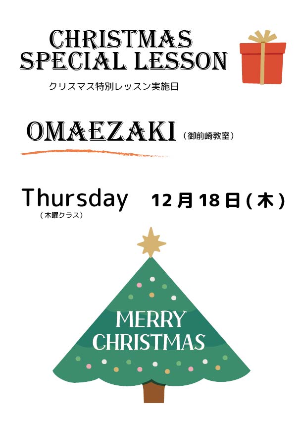 在校生以外の方にも、クリスマスレッスンに体験にお越しいただけますので、ご興味のある方は当校ウェブサイトのお問い合わせフォームよりご連絡ください。